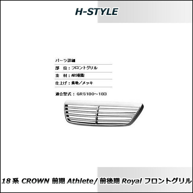 【商品名】 H-STYLE製 18クラウン用フロントグリル(メッキ) 【適合型式】 CROWN GRS18系 アスリート:前期 ロイヤル:前/後期 前期:2003年12月〜2005年9月 後期:2005年10月〜2008年1月 ※後期アスリートは対応しておりません。